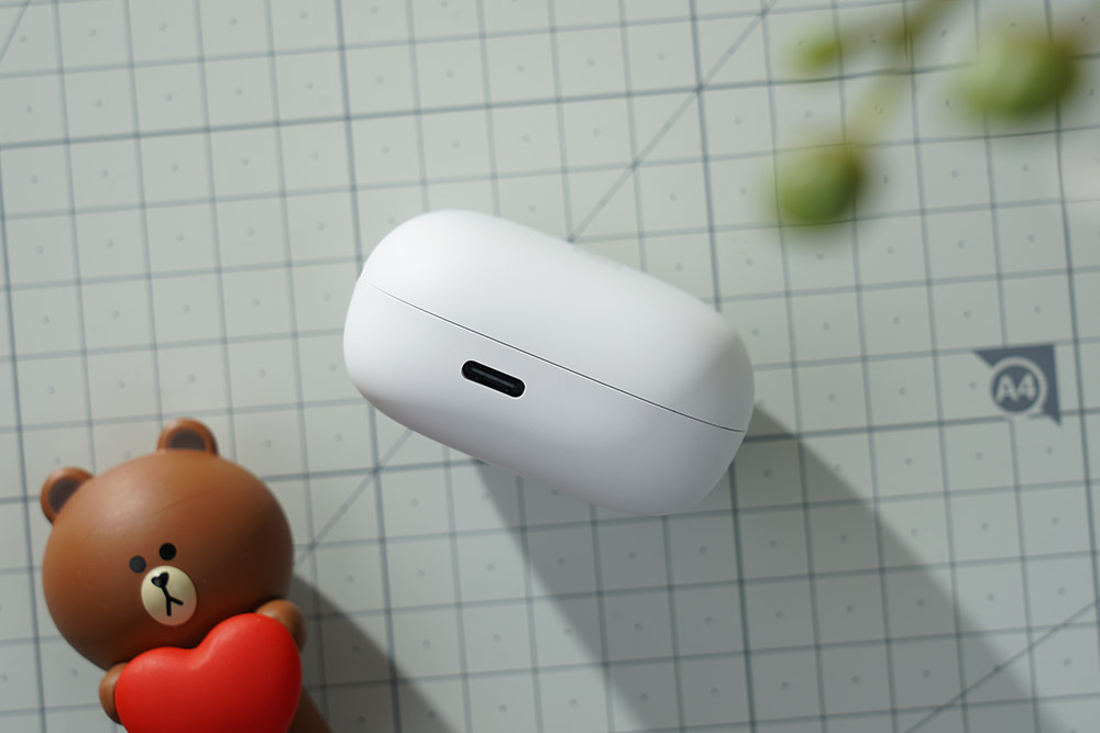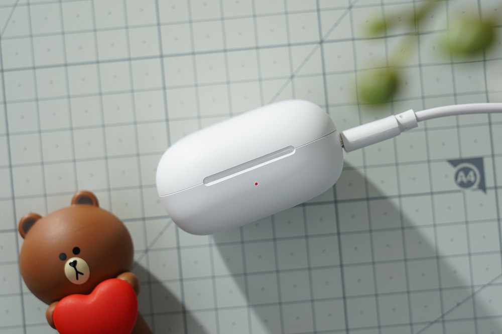 QCY T13 ANC 블루투스 이어폰의 충전 케이스를 살펴보면 앞쪽에는 충전 상태를 표시해주는 LED가 배치되어 있고 완전히 충전되면 빨간색에서 하얀색으로 변경됩니다. 그리고 옆쪽에 USB-C 포트가 배치되어 있습니다.