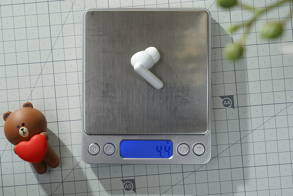 QCY T13 ANC 블루투스 이어폰의 무게는 약 46.7g으로 측정되었습니다. 전체적으로 휴대하는데 크게 신경이 쓰일 것 같지는 않았습니다. 그리고 충전 케이스의 표면은 매트한 느낌으로 마무리되었고 아마도 흠집에는 취약할 것으로 예상합니다.