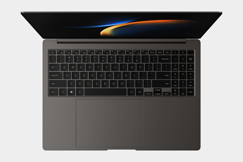갤럭시 북 3 프로 16인치 모델의 키보드를 확인해 보면 숫자 패드가 포함되어 있어서 문서 작업 용도로도 활용할 수 있습니다. 그리고 터치패드는 큼지막한 편이고 지문인식 센서가 전원 버튼에 통합되어 있습니다. 참고로 IR 카메라를 이용한 얼굴인식 기능은 지원하지 않은 것으로 보입니다.