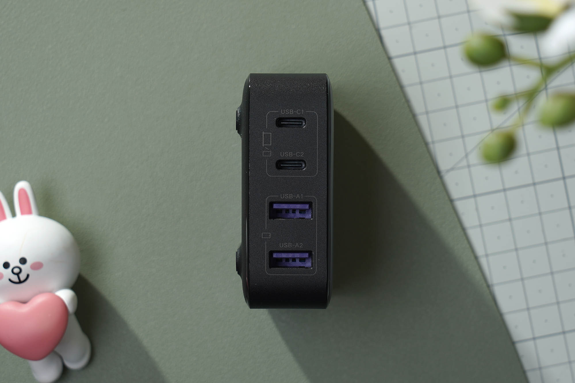 옆면을 살펴보면 유그린(UGREEN) 65W GaN 충전기에는 2개의 USB-C 포트와 2개의 USB-A포트가 배치되어 있는 것을 확인할 수 있습니다. 참고로 USB-C포트에서는 PD3.0, PPS, QC4 +(QC4.0/QC3.0), SCP(10V2.25A), FCP, AFC, 애플 5V2.4A, BC1.2를 USB-A포트에서는 SCP(10V2.25A), QC3.0, FCP, AFC, 애플 5 v2.4a, BC1.2 고속 충전 프로토콜을 지원합니다.
