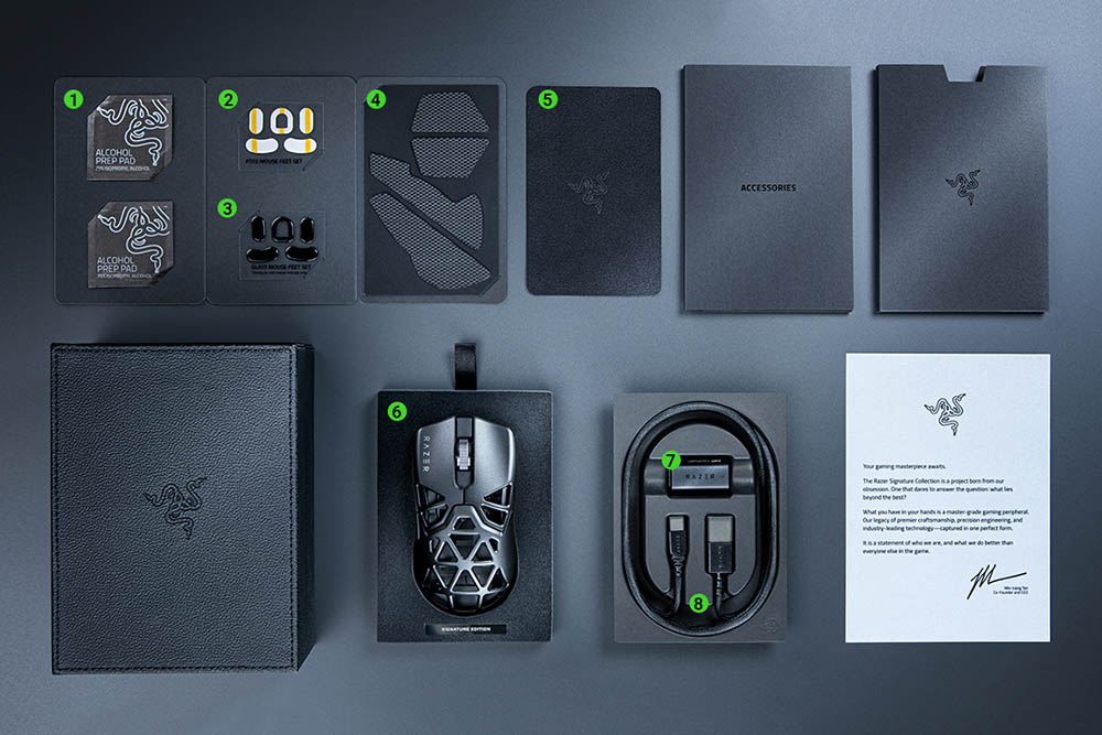 레이저 바이퍼 미니 시그니처 에디션 마우스의 구성품을 살펴보면 1.알코올 프렙 패드 2세트, 2. PTFE 마우스 피트 1세트, 3. Corning® Gorilla® Glass 3 마우스 피트 1세트, 4. Razer Mouse Grip Tape 2세트, 5. 청소용 극세사천 1개, 6. Razer Viper Mini Signature Edition 1개, 7. Razer Viper Mini Signature Edition용 Razer HyperPolling Wireless Dongle 1개, 8. USB Type A to USB Type C Speedflex 케이블 1개로 구성되어 있습니다. 프리미엄 제품이라서 피트가 넉넉한 편입니다.