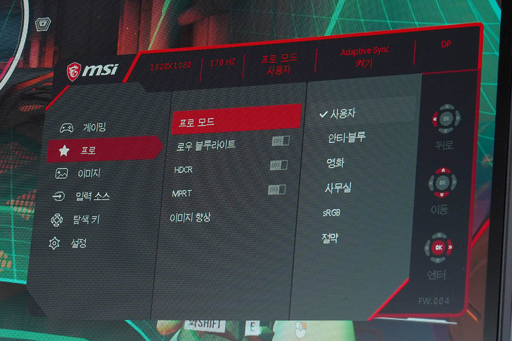 프로에서는 프로 모드를 변경하거나 로우 블루라이트를 켜고 HDCR이나 MPRT 기능을 켜고 끌 수 있습니다. 참고로 장시간 문서를 읽어야 하는 분들은 안티-블루나 로우 블루라이트 옵션을 사용하는 것을 추천합니다.