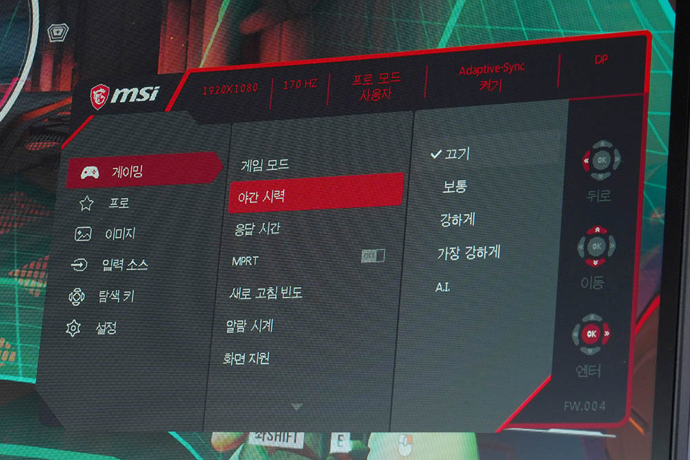 그리고 야간 모드는 보통과 강하게 가장 강하게, A.I.로 설정할 수 있는데요. 화면의 암부 영역을 조절해서 숨어 있는 상대를 조금 더 빠르게 찾을 수 있도록 도와주는 역할을 합니다. (위-끄기, 아래-가장 강하게)