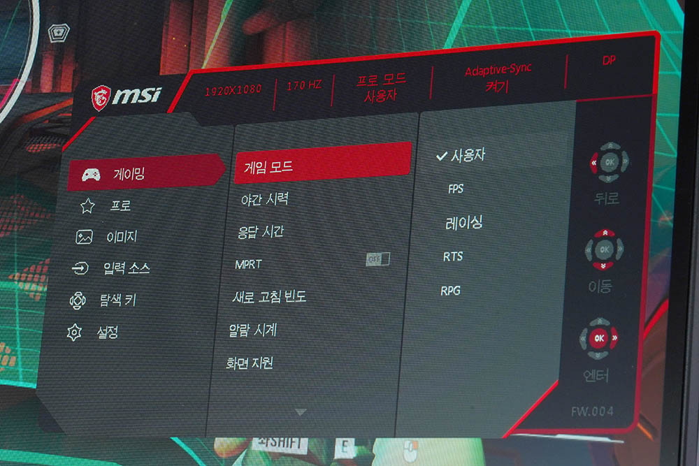 MSI G27C5 E2 커브드 게이밍 모니터의 OSD를 확인해 보면 게이밍의 게임 모드에서는 자신의 플레이하는 게임의 종류(FPS, 레이싱, RTS, RPG)에 맞게 빠르게 설정을 변경할 수 있습니다.