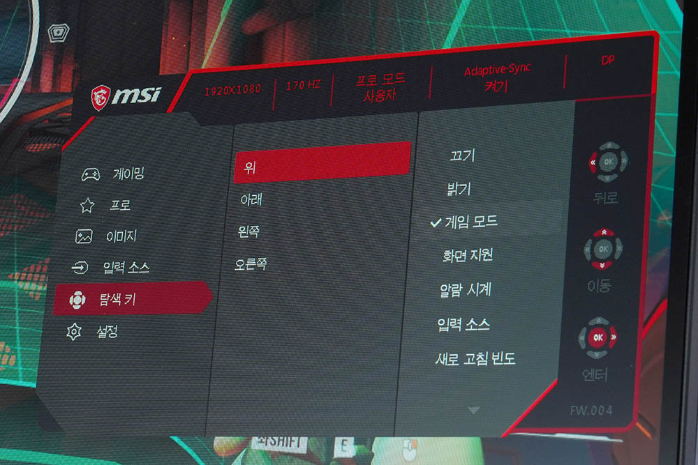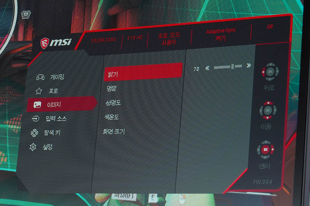이미지에서는 밝기나 명암 그리고 선명도 등을 조절할 수 있습니다. 주변 환경의 조도에 따라서 MSI G27C5 E2 커브드 게이밍 모니터의 설정을 변경하는 것이 좋을 것 같습니다.