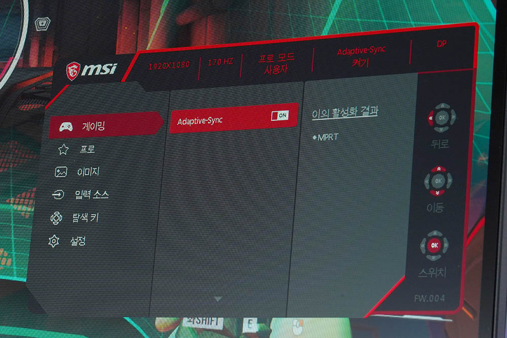 그리고 NVIDIA 지싱크호환이나 AMD 프리싱크 프리미엄 기능을 사용하려고 할 때는 게이밍 메뉴의 두 번째 페이지에 배치된 Adaptive-Sync 기능을 켜 놓아야지만 전용 프로그램에서 해당 옵션이 활성화됩니다.