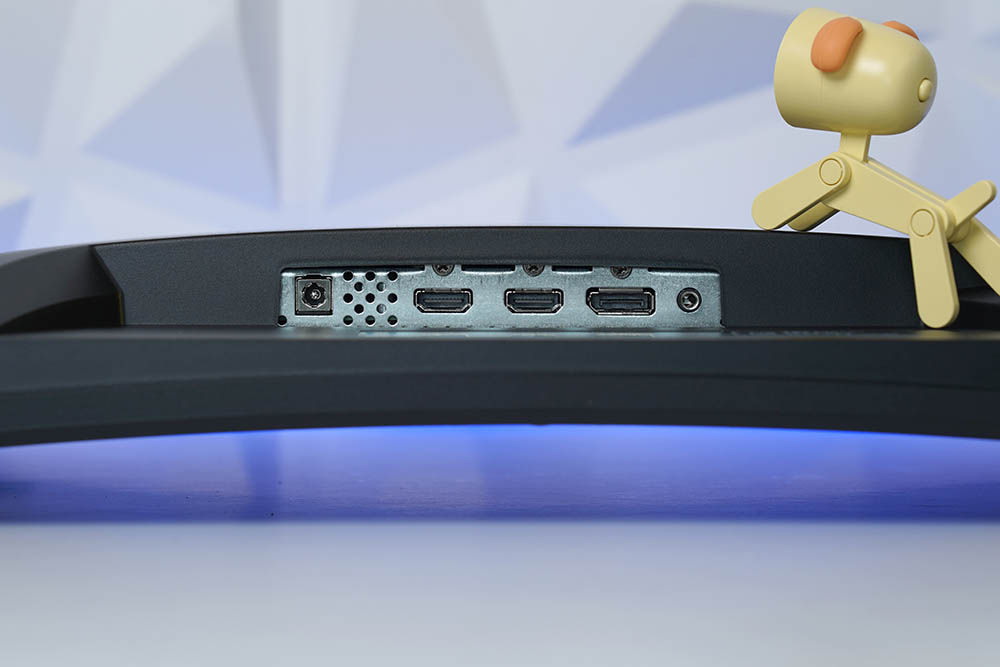 MSI G27C5 E2 커브드 게이밍 모니터의 아래쪽을 확인해 보면 전원과 1개의 DP 1.2a(최대 170Hz) 그리고 2개의 HDMI 1.4b(최대 144Hz)와 3.5mm 이어폰 아웃 단자가 배치되어 있습니다.