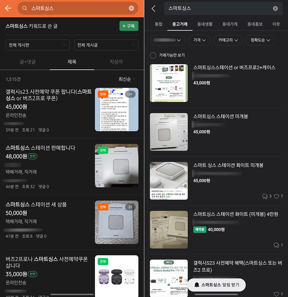 스마트싱스 스테이션은 갤럭시 S23 사전예약 사은품으로 제공되었습니다. 그래서 중고나라나 당근마켓을 뒤져보면 이미 많은 숫자의 제품들이 판매되고 있는 것을 확인할 수 있습니다. 가격은 4만원에서 5만원 정도에 형성되어 있습니다. 40,000원 정도에는 순삭이고 보통 45,000원 정도에서 여유 있게 구할 수 있습니다. 그리고 지금은 초반이기 때문에 조금 더 시간이 지나면 아마도 4만원 정도에 수렴할 것으로 보입니다.
