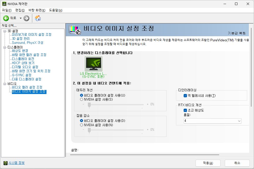 다음에는 NVIDIA 제어판의 비디오 – 비디오 이미지 설정 조정 – RTX 비디오 개선 – 초고 해상도 품질을 1에서 4까지 자신의 취향에 따라서 변경할 수 있습니다. 참고로 숫자가 클수록 품질이 개선되지만 반대로 그래픽카드 사용량과 온도가 높아질 수 있습니다.