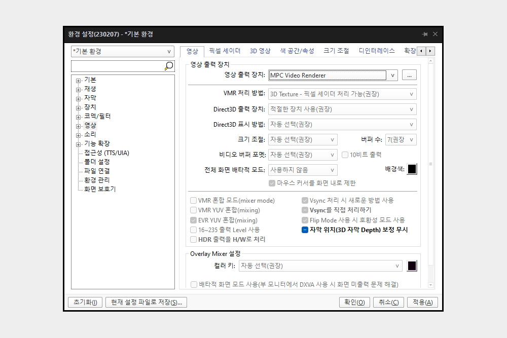 그리고 환경 설정의 영상에서 영상 출력 장치를 MPC Video Renderer로 변경하시면 기본적인 설정이 완료됩니다. 과정 자체는 크게 어렵다고 이야기하는 어려울 것 같습니다.