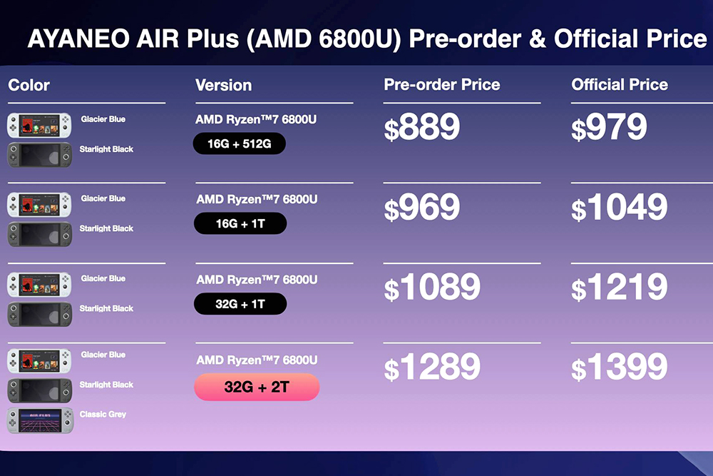 AYA NEO Air Plus 휴대용 게임기의 색상은 블루(Glacier Blue)와 블랙(Starlight Black) 그리고 그레이(Classic Gray) 중에서 선택할 수 있습니다. 특히 그레이 모델의 경우에는 AMD 라이젠7 6800U 프로세설를 탑재한 모델에서만 선택할 수 있습니다.