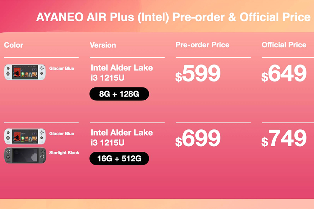 AYA NEO Air Plus 휴대용 게임기의 가격은 예상보다는 비싼 편이라고 할수 있습니다. 12세대 인텔 i3-1215U 프로세서 모델의 경우에는 8GB 메모리 + 128GB SSD 버전이 프리 오더일 때는 $599(약 78만원)이고 정식 판매 가격은 $649(약 85만원)입니다. 그리고 16GB 메모리 + 512GB SSD 버전은 프리 오더일 때는 $699(약 91만원)이고 정식 판매 가격은 $749(약 98만원)입니다.