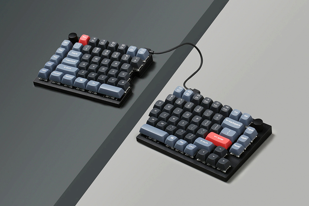 키크론 Q12 스플릿 기계식 키보드는 좌우 분할 레이아웃으로 제작되었습니다. 그리고 두 제품은 브릿지 케이블로 연결된 형태입니다. 특히 유용한 부분은 좌우를 독립적으로 활용할 수 있다는 점입니다. 그리고 좌우 모두에 최근 커스텀 키보드에서 유행하고 있는 노브가 장착되어 있습니다.