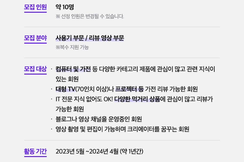 프리미엄 리포터 16기의 모집 인원은 약 10명이고 분야는 사용기와 리뷰 영상 부분으로 나누어져 있습니다. 사진과 영상 리뷰 정도로 보시면 좋을 것 같습니다. 그리고 대상의 경우에는 컴퓨터나 가전은 물론이고 대형 TV 그리고 각종 먹거리 등도 포함된 것을 확인할 수 있습니다. 참고로 기간은 2023년 5월부터 2024년 4월까지 약 1년 정도입니다.