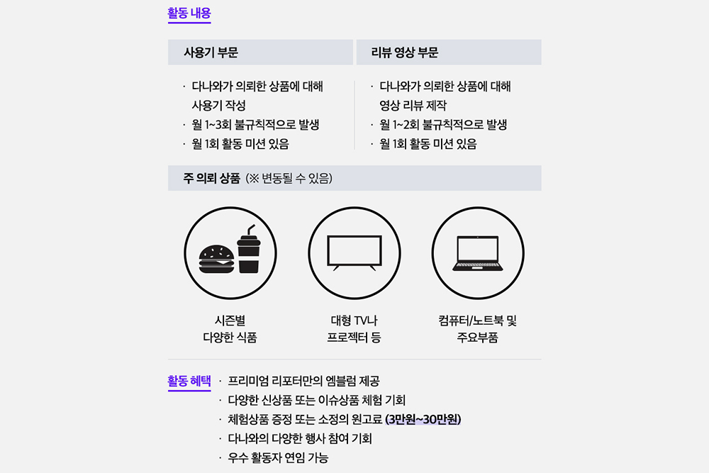 활동 내역의 경우에는 월 1~3회 정도 불규칙적으로 리뷰 제품들의 의뢰가 별도의 카페에 게시되고 지원을 통해서 사용기나 리뷰 영상을 제작하면 됩니다. 그리고 혜택의 경우에는 신제품을 빠르게 체험해 볼 수 있고 제품에 따라서 소정의 원고료가 지급됩니다.
