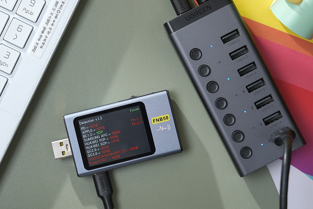 유그린 7-IN-1 USB3.0 허브는 BC 1.2 충전 프로토콜을 지원하고 최대 7.5W 정속도로 충전을 할 수 있습니다. 테스트 결과 디바이스나 케이블에 따라서 약간 호환성 이슈가 있는 것 같습니다.