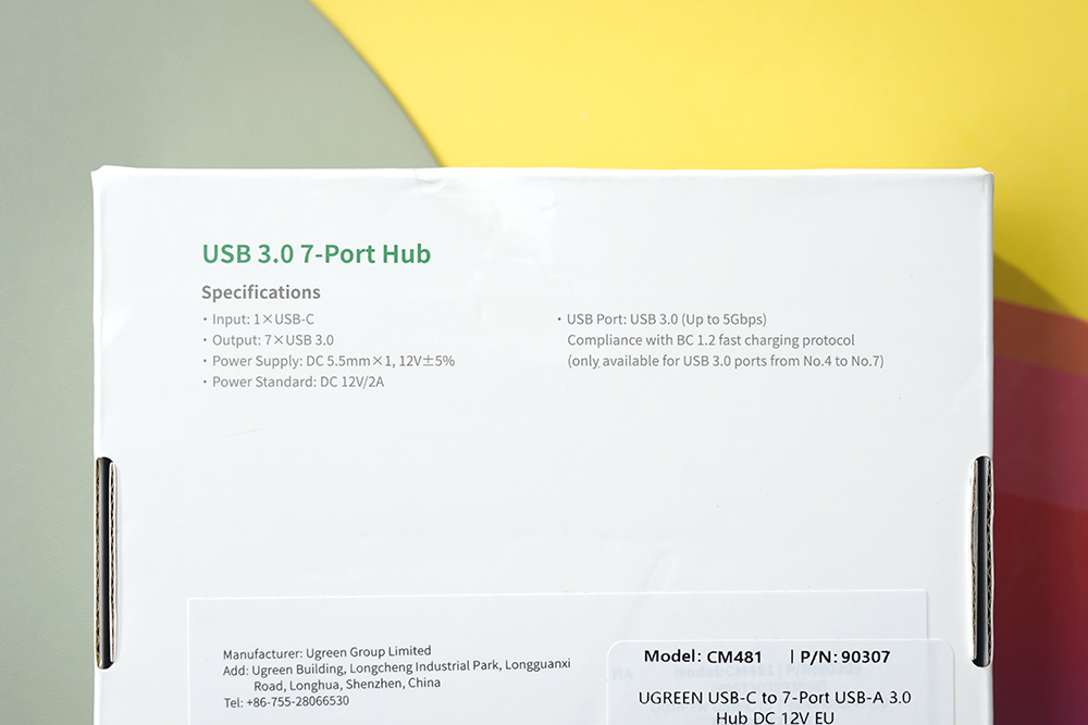유그린 7-IN-1 USB3.0 허브의 스펙을 살펴보면 USB-C 포트를 통해서 입력받을 수 있고 출력은 USB 3.0 포트가 7개 탑재되었습니다. 그리고 유전원으로 설계되었기 때문에 어댑터가 기본으로 제공됩니다.