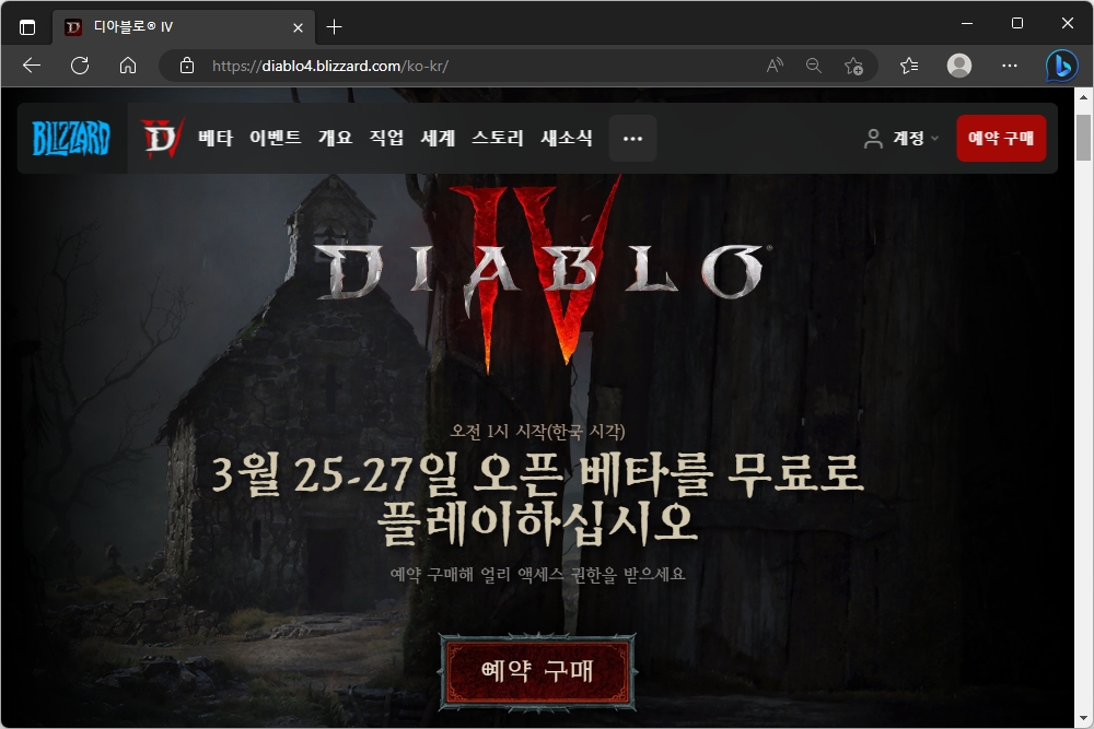 우선 아래쪽에 있는 디아블로4 홈페이지에 접속하면 2023년 3월 25일부터 27일까지 오픈 베타를 무료로 플레이할 수 있는 내용이 표시되어 있습니다. 참고로 한국 시각 오전 1시를 기준으로 진행될 예정입니다.