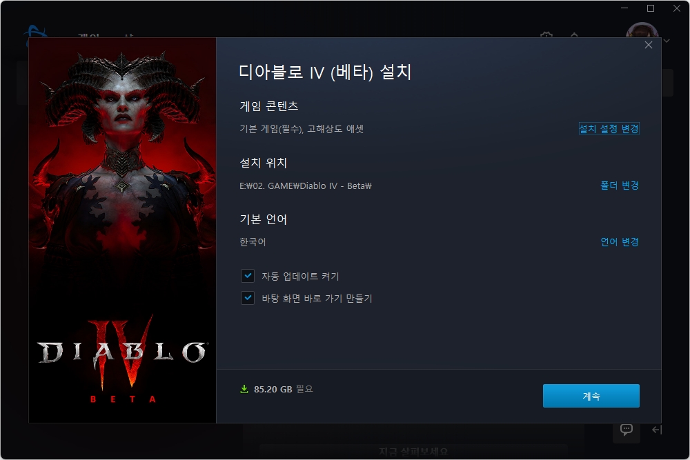 배틀넷 클라이언트의 디아블로4 파트를 확인해 보면 디아블로4 – 베타 버전을 다운로드 받을 수 있는 메뉴가 준비되어 있습니다. 용량은 고해상도 애셋을 포함해서 85.2GB로 작은 편은 아니라고 할 수 있습니다.