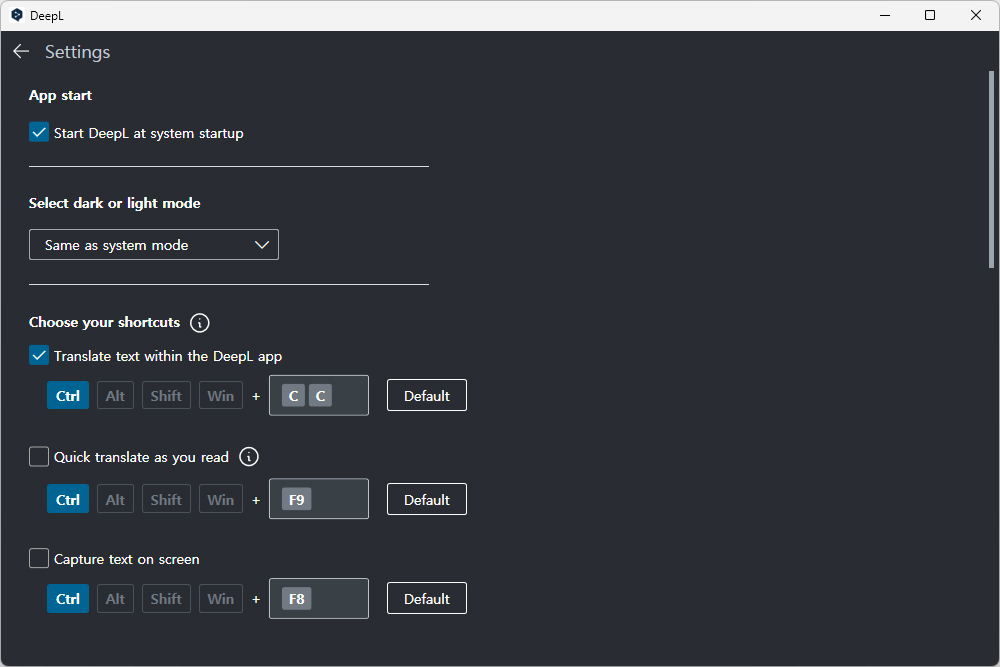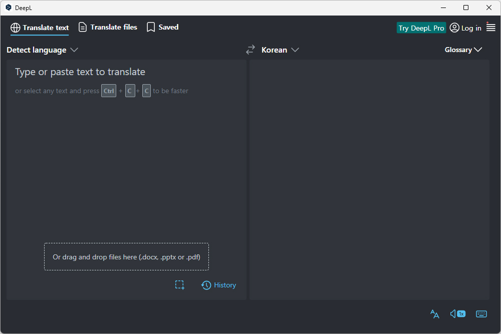 DeepL AI 번역기의 인터페이스는 심플한 느낌을 주는 편입니다. 그리고 편리한 기능 중의 하나는 컨트롤(Ctrl) + C + C 단축키를 이용해서 현재 선택한 텍스트를 바로 번역할 수 있다는 점입니다.