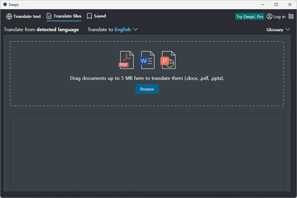 그리고 DeepL AI 번역기에는 pdf나 docx 그리고 pptx 파일을 드래그해서 번역할 수 있는 기능을 지원합니다. 참고로 용량은 5MB 정도인데요. 일반적으로 사용하기에 크게 부족하지는 않으리라고 예상합니다.