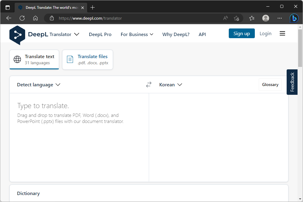 DeepL AI 번역기는 아래의 홈페이지에 접속해서 사용할 수 있습니다. 프로 버전을 이용하면 조금 더 고급 기능을 사용할 수 있지만 무료 버전도 일상적으로 사용하기에 크게 부족함이 없습니다.