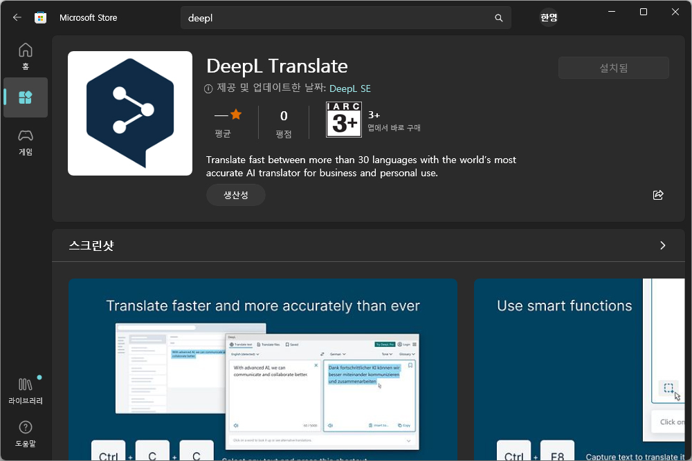DeepL AI 번역기를 윈도우에서 본격으로 활용하고 싶으신 분들은 마이크로소프트 스토어에서 DeepL Translate를 검색해서 설치해주면 됩니다. 웹브라우저를 이용하는 것과 비교해서 조금 더 편리한 편입니다.
