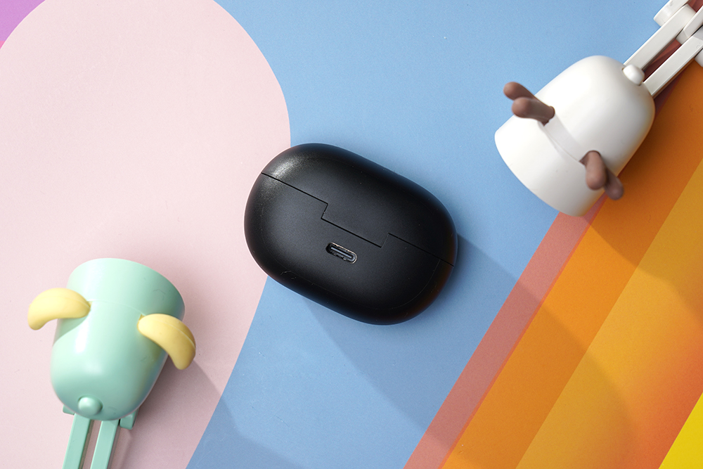QCY HT07 노이즈 캔슬링 이어폰의 충전 케이스는 상당히 콤팩트한 크기로 제작되었습니다. 그리고 전면에는 상태를 확인할 수 있는 LED가 배치되어 있고 뒤쪽에 충전을 위한 USB-C 포트가 탑재되었습니다.