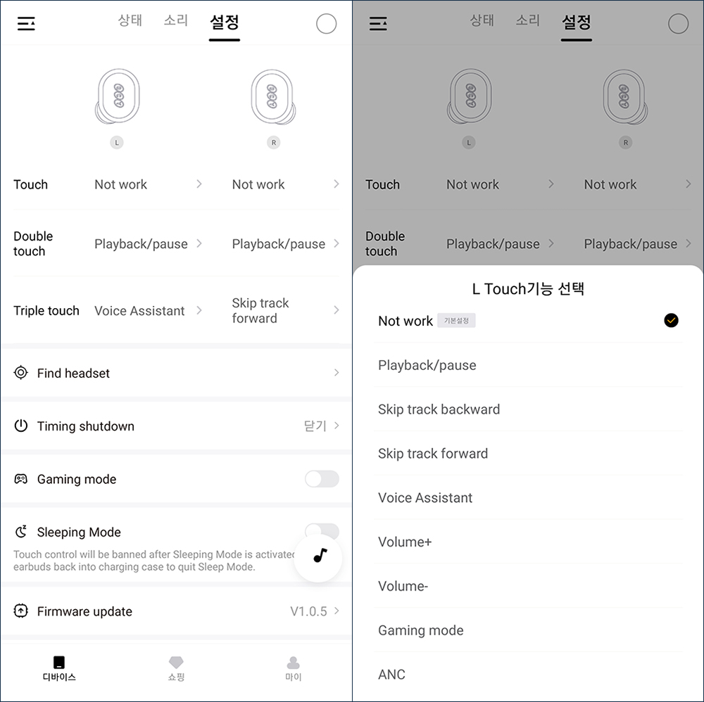 설정에서는 좌우 터치 스위치의 작동 방식을 변경할 수 있습니다. 그리고 자동 꺼짐 시간이나 게이밍 모드도 설정할 수 있습니다. 참고로 최신 펌웨어 버전은 V1.0.5입니다. 앱의 기능은 다양한 편이지만 완성도가 그렇게 높아 보이지는 않았습니다.