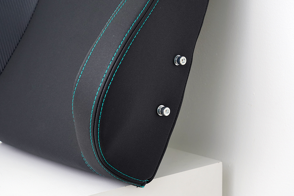 노블체어 에픽 메르세데스 F1 에디션 게이밍 의자의 디자인을 자세하게 살펴보면 전면은 흡사 F1 레이싱 카의 시트처럼 은색 하네스 구멍과 페트로나스 그린 (PETRONAS green) 스티치가 상당히 인상적이었습니다.