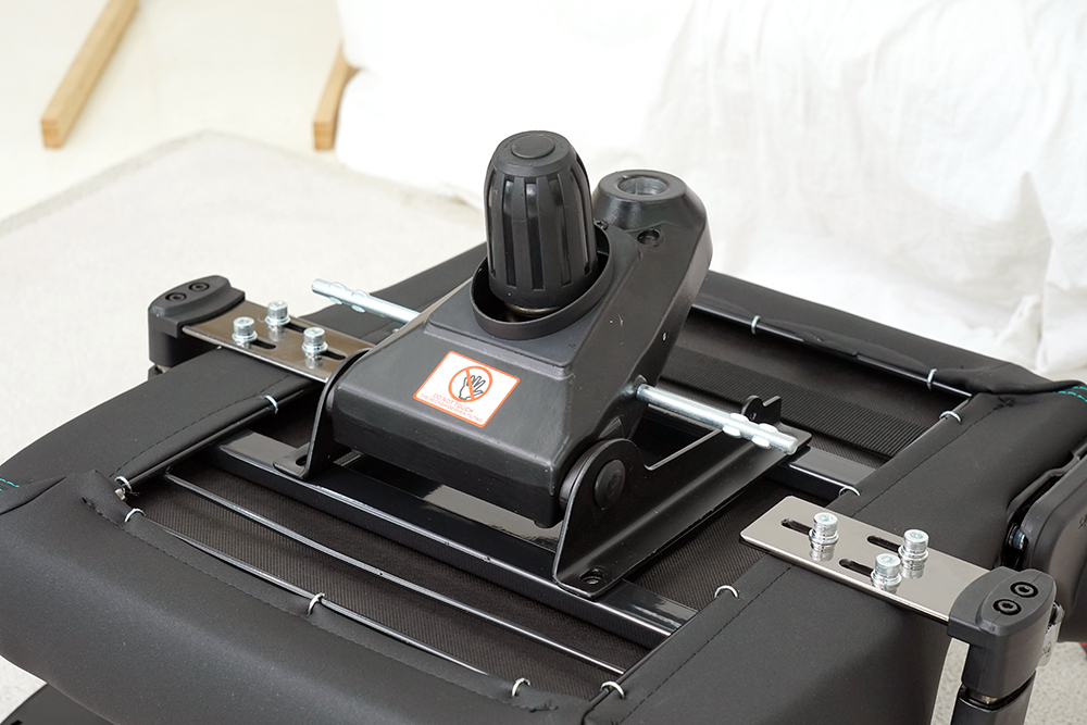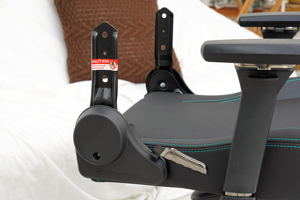그리고 시트의 뒤쪽을 살펴보면 메탈로 제작된 등받이 각도 조절 레버와 함께 등받이가 연결되는 부분에 손을 조심하라는 경고 문구가 인쇄된 스티커가 부착된 것을 확인할 수 있습니다. 참고로 레버를 당기면 강한 힘으로 앞으로 이동하기 때문에 조립할 때 주의해야 합니다.