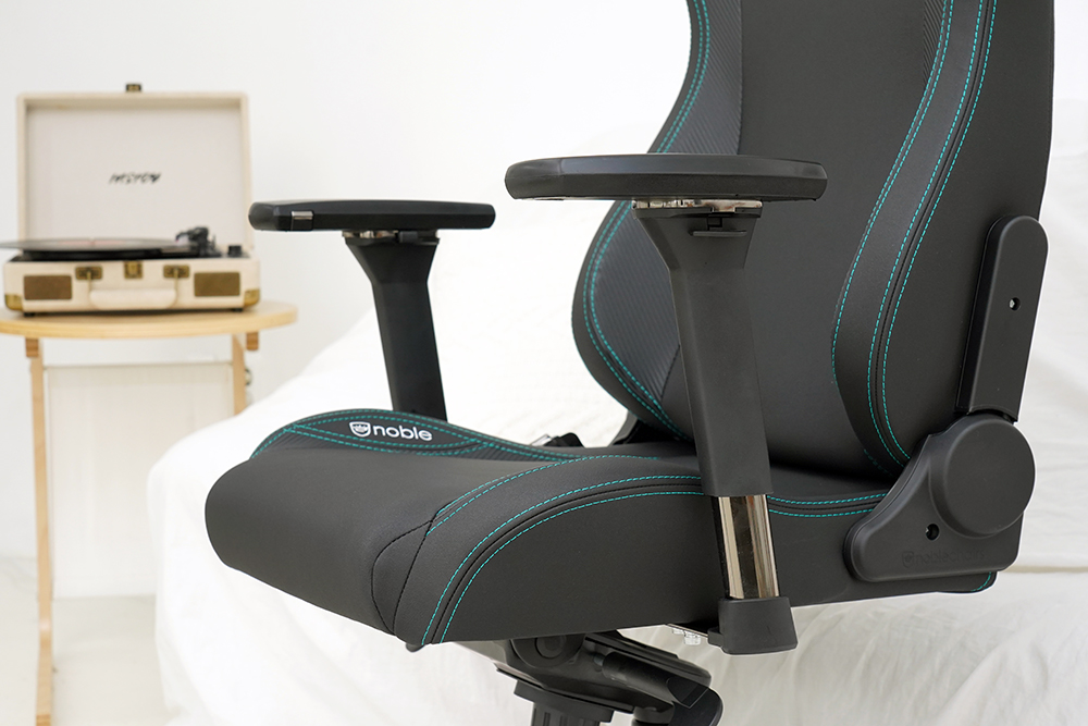 노블체어 에픽 메르세데스 F1 에디션 게이밍 의자의 앞 옆에는 다양한 방향으로 조절할 수 있는 4D 팔걸이가 배치되어 있습니다. 그리고 만약 좌우로 조금 여유가 필요한 분들은 동봉된 육각 렌치를 이용해서 확장할 수 있습니다.