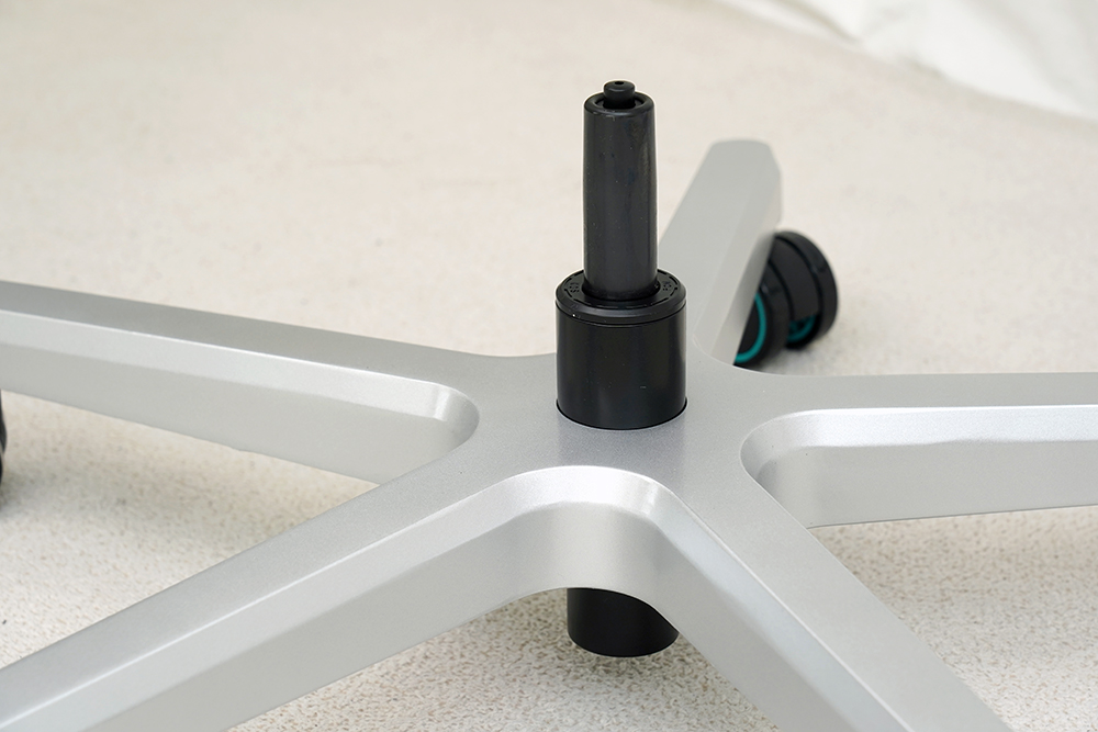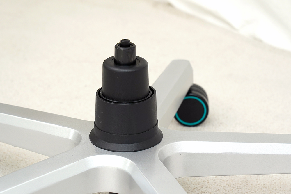 다음에는 시트와 결합된 틸트 메커니즘과 휠 베이스를 유압식 가스 실린더 중심봉을 기준으로 결합해주면 됩니다. 이때는 약간의 힘이 필요하므로 2인 1조로 작업을 하는 것을 추천합니다.