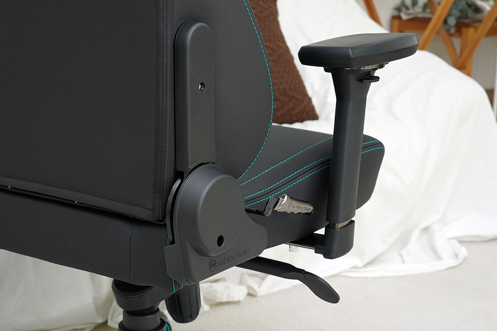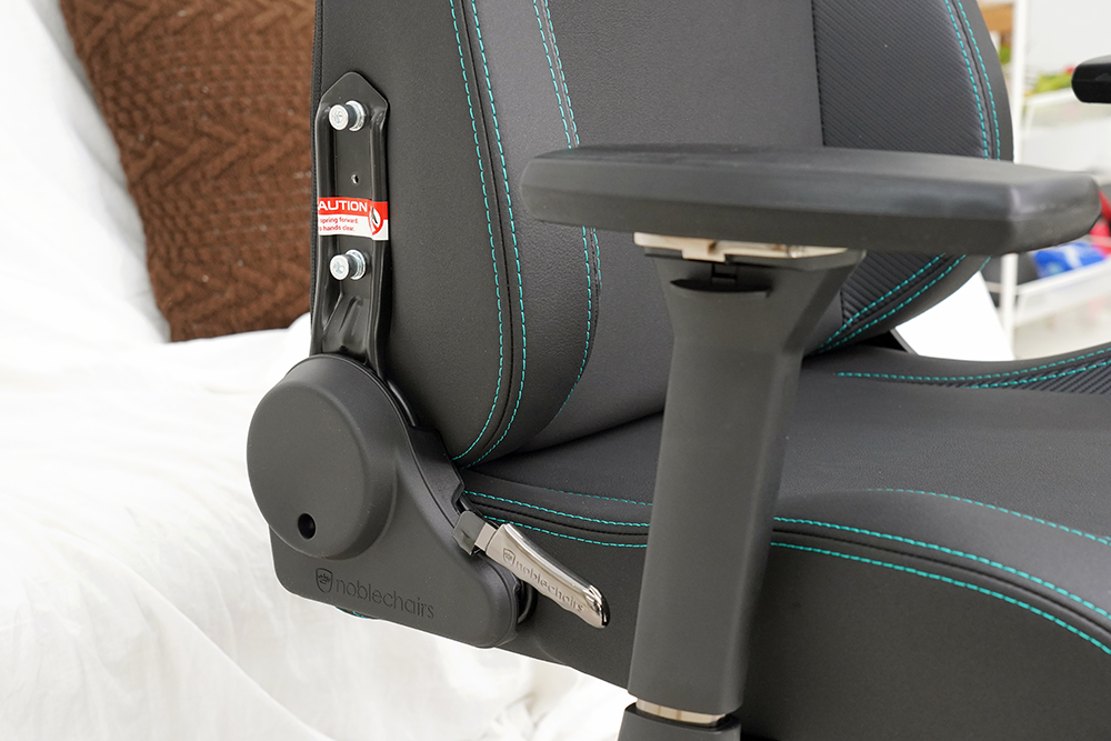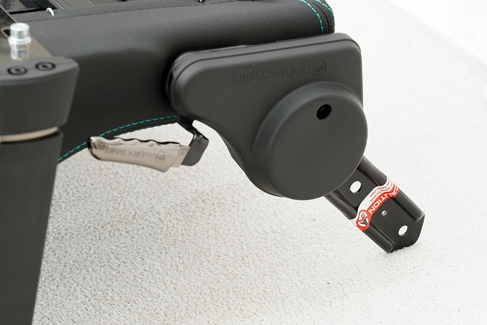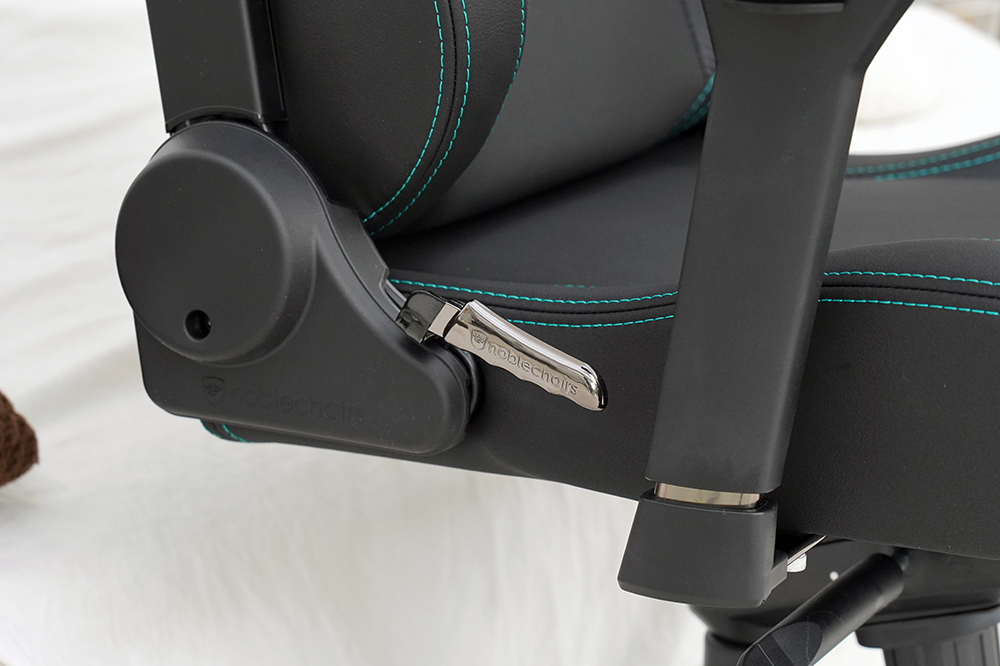 그리고 노블체어 에픽 메르세데스 F1 에디션 게이밍 의자의 오른쪽에는 등받이의 각도를 조절할 수 있는 금속으로 제작된 레버가 배치되어 있는데요. 만듦새가 상당히 뛰어난 편이었습니다.