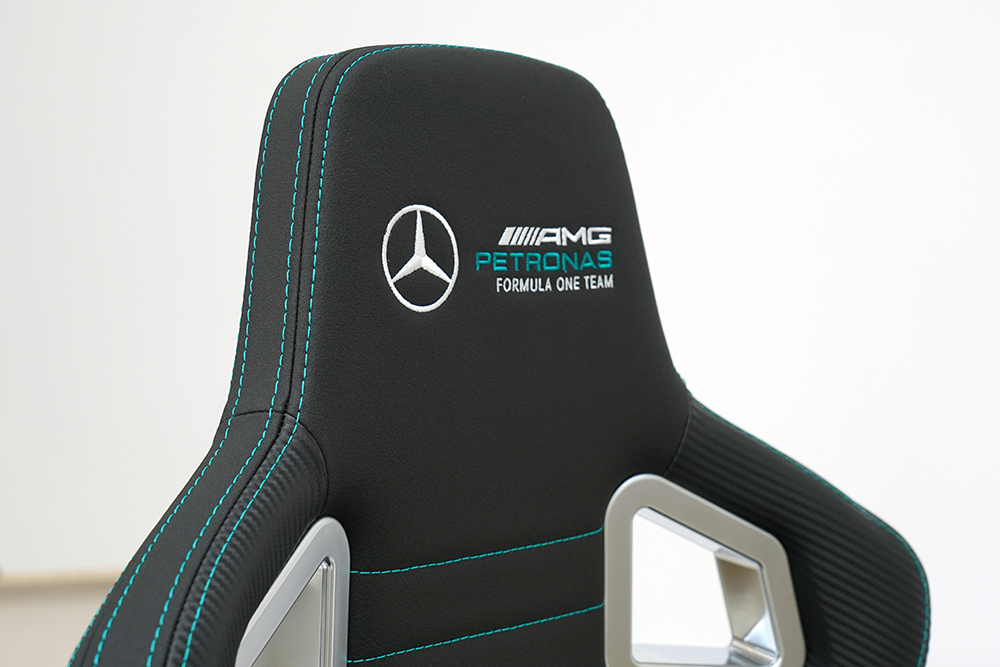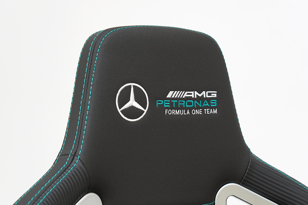 노블체어 에픽 메르세데스 F1 에디션 게이밍 의자의 디자인적인 특징들을 자세하게 살펴보면 우선 머리 받침에 정밀하게 자수가 놓아져 있는 MERCEDES-AMG PETRONAS FORMULA ONE TEAM 로고가 인상적이었습니다. 게임용 의자에서 이런 정도의 디테일을 찾아보기는 어려운 것 같습니다.