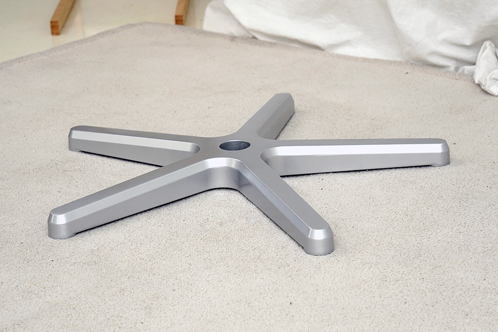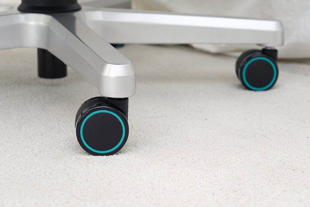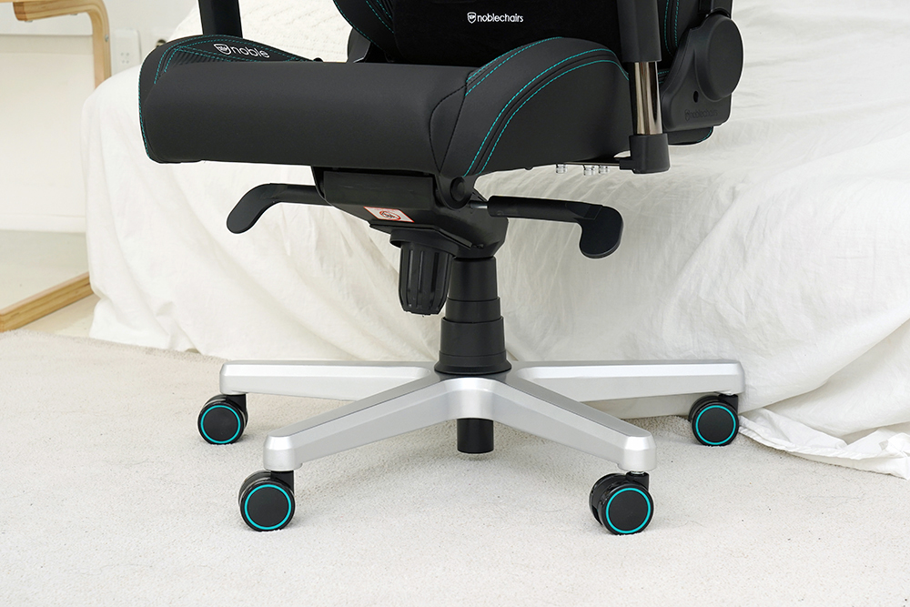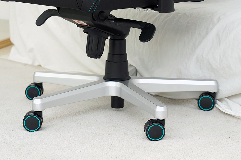 노블체어 에픽 메르세데스 F1 에디션 게이밍 의자의 휠 베이스는 경량의 알루미늄 프레임으로 제작되었고 안정적으로 몸을 지탱할 수 있도록 오발(5발) 형태로 제작된 것을 확인할 수 있습니다.