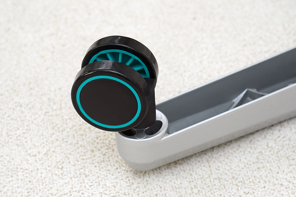 그리고 60mm 사이즈의 나일론 바퀴에는 페트로나스 그린 색상의 포인트가 들어가 있고 PU 가죽으로 코팅되어서 있어서 이동을 할 때 상대적으로 조용한 편이었습니다.