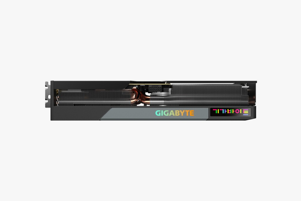 기가바이트 RTX 4070 KOREA 에디션 그래픽카드의 옆면을 살펴보면 16핀 파워 커넥터가 배치된 것을 확인할 수 있습니다. 그리고 GIGABYTE 로고 부분에 RGB FUSION 조명이 탑재되었고 다양한 라이트 효과를 제공합니다.