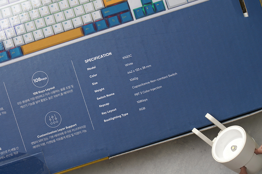앱코 KN20C 무접점 키보드의 스펙을 확인해 보면 색상은 화이트로 제작되었고 크기는 442 x 133 x 38mm이고 무게는 1.06kg입니다. 참고로 레이아웃은 우리에게 가장 익숙한 108키로 제작되었습니다.