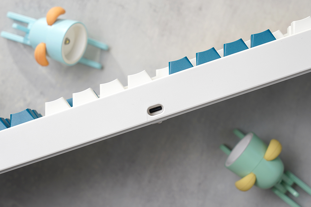 앱코 KN20C 무접점 키보드의 옆면 중앙에는 USB C타입 포트가 배치되어 있습니다. 커넥터의 방향에 상관없이 케이블을 연결할 수 있다는 장점이 있지만 단자의 깊이가 제법 깊은 편이어서 호환되는 케이블이 종류는 제한적입니다.