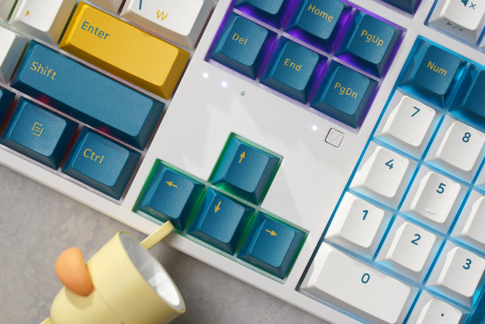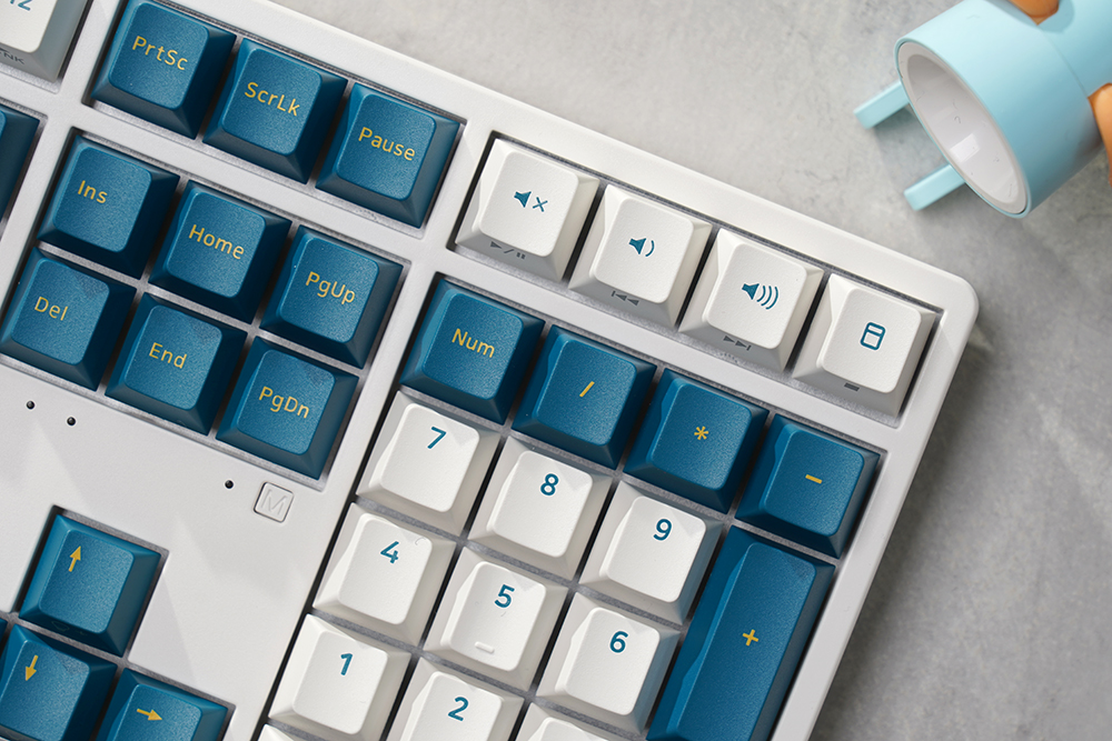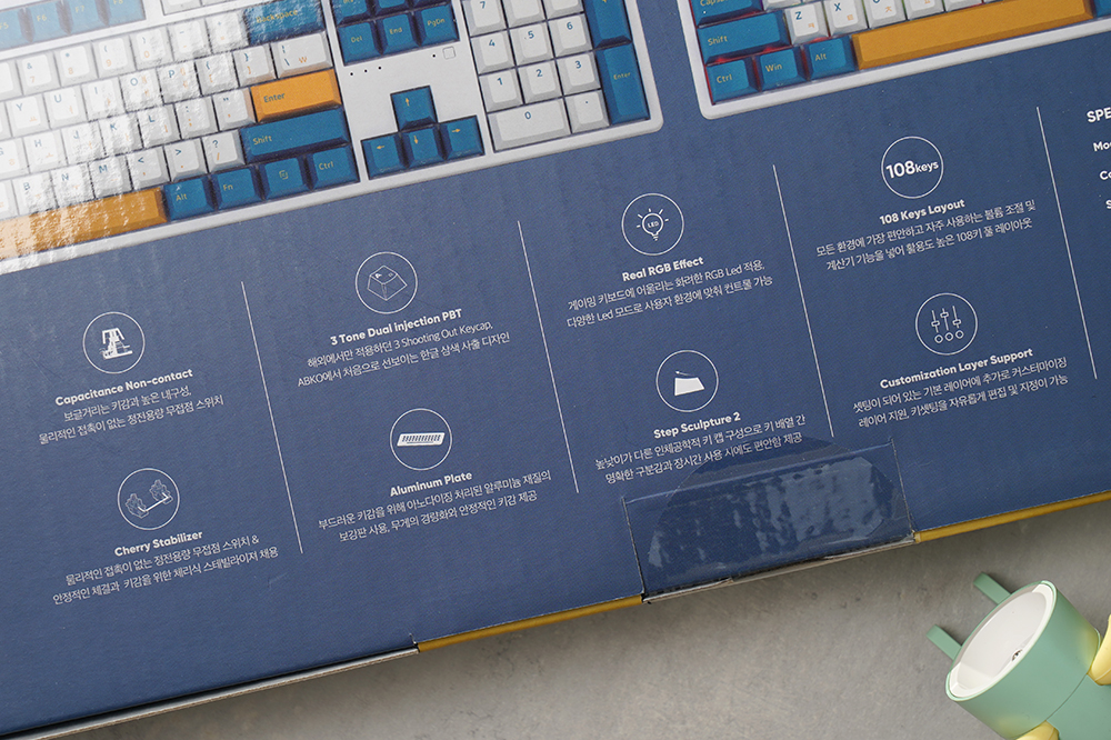앱코 KN20C 무접점 키보드에는 크림 베이지와 팁 옐로우 그리고 딥 블루로 구성된 삼색 사출 키캡이 적용되었습니다. 디자인적인 완성도가 높은 것은 물론이고 PBT로 제작되어서 손으로 만지는 느낌도 상당히 좋은 편입니다.