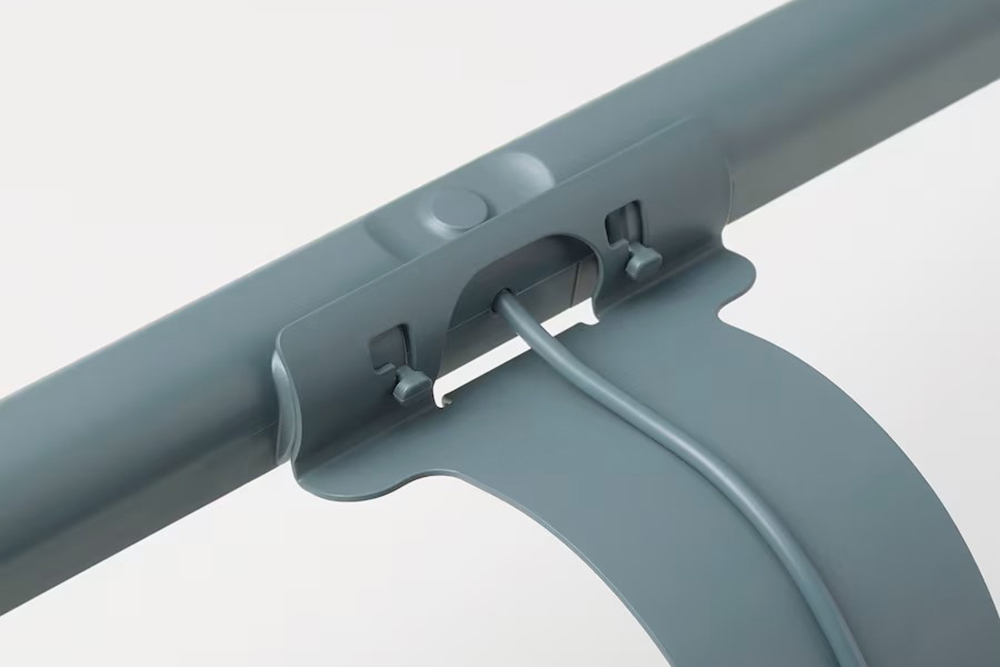 이케아 라게르공 모니터 LED 조명은 행거를 이용해서 모니터에 고정할 수 있도록 설계되었습니다. 참고로 소재를 살펴보면 갓은 ABS 플라스틱으로 제작되었고 행거는 파우더코팅이 적용된 스틸로 마무리되었습니다.