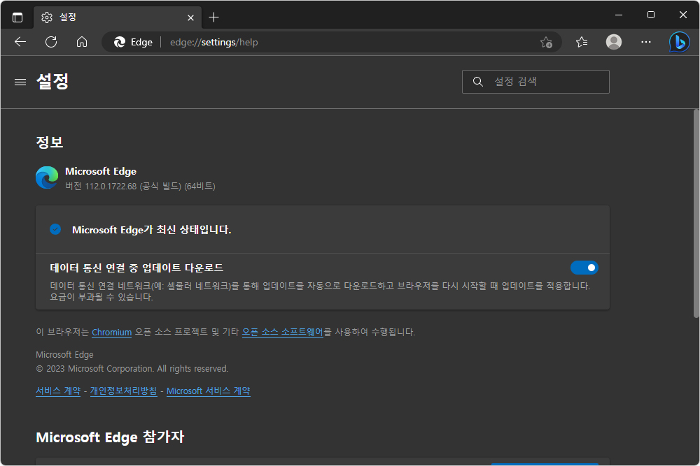 마이크로소프트 엣지는 예전에는 편의성과 성능이 떨어진다는 평가를 받았지만 크로뮴 기반으로 변경된 후에는 사용성이 크게 개선되었습니다. 특히 최근에는 챗 GPT 기능이 추가되어서 활용도 역시도 상당히 좋아졌습니다. 그래서 저도 많이 활용하고 있습니다. 최신 버전으로 업데이트 방법은 역시 오른쪽의 점 3개를 선택하고 설정을 확인해 보면 최신 버전으로 업데이트가 진행됩니다. (최신 버전은 112.0.1722.68)