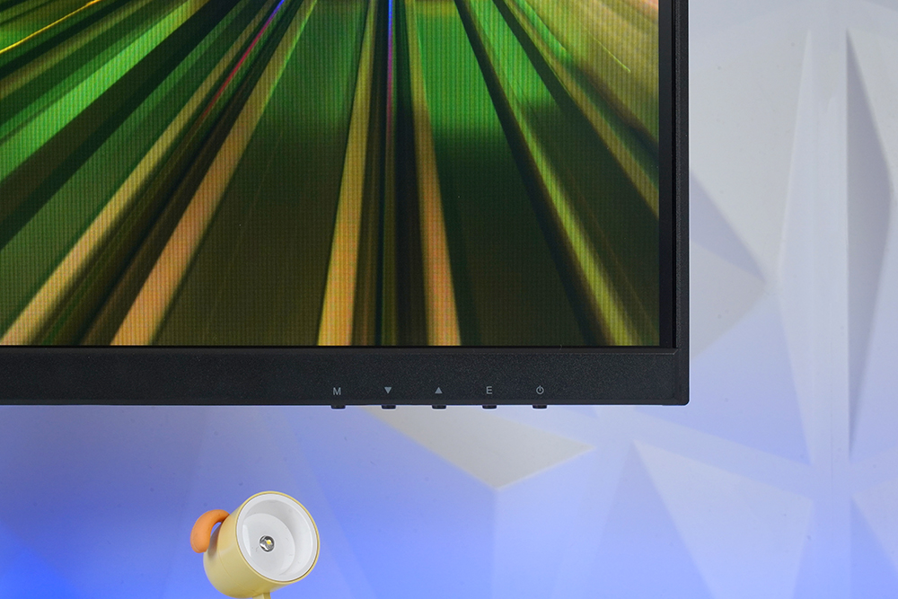 주연테크 V27Q-M 모니터 전면의 오른쪽 아래에는 각종 버튼이 배치되어 있습니다. 각각의 버튼이 어떤 역할을 하는지 직관적으로 설명되어 있어서 어렵지 않게 활용할 수 있습니다. 그 외에도 상태를 확인할 수 있는 LED가 아래쪽을 향하도록 장착되어 있습니다.