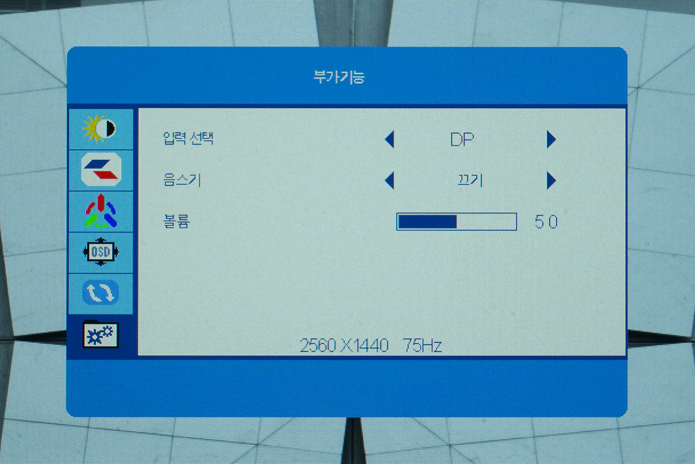 마지막으로 부가 기능에서는 입력 장치를 변경하고 음소거 기능을 사용하거나 볼륨을 조절할 수 있는 기능들이 준비되어 있습니다. 그리고 아래쪽에 현재 해상도와 주사율이 같이 표시됩니다.