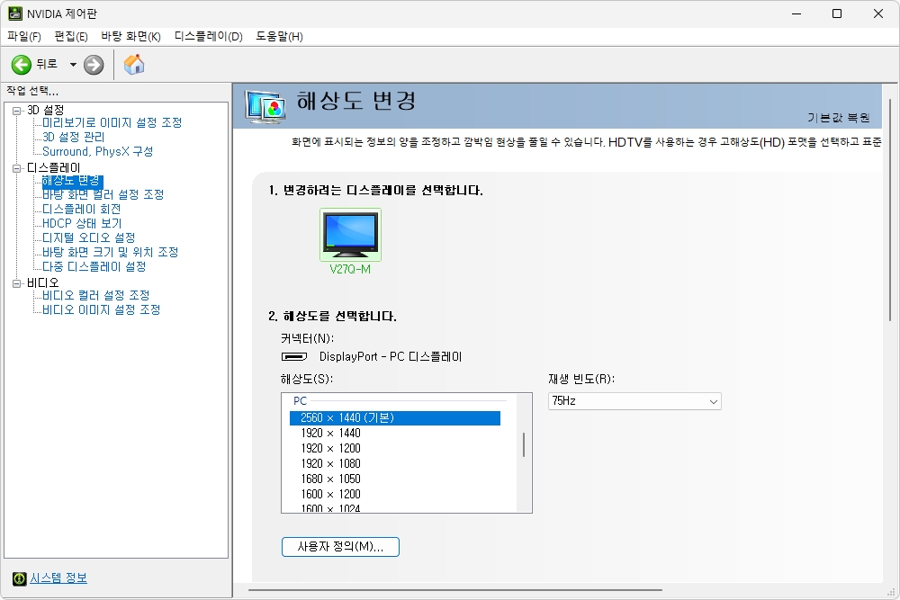 주연테크 V27Q-M 모니터의 패널 정보를 자세하게 살펴보면 QHD (2560 x 1440) 해상도를 지원해서 FULL HD (1920 x 1080)과 비교해서 더 넓은 작업 공간을 확보할 수 있습니다. 그리고 75Hz/5ms(OD) 주사율을 제공하기 때문에 조금 더 부드러운 화면을 체감할 수 있습니다.