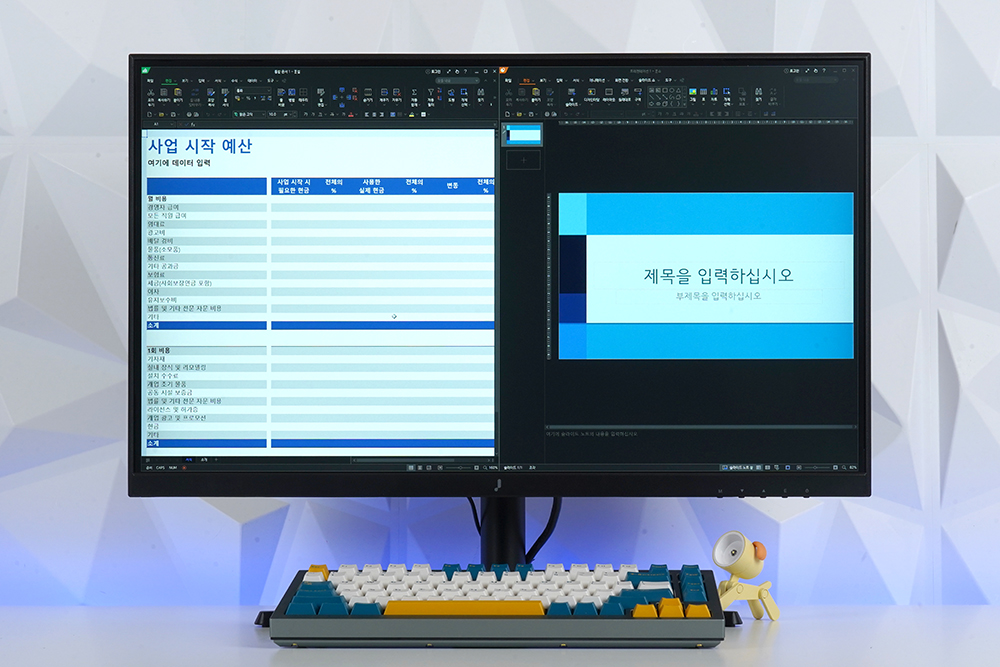 주연테크 V27Q-M 모니터의 활용 방법을 살펴보면 우선 QHD (2560 x 1440)의 패널을 탑재해서 FULL HD (1920 x 1080)와 비교해서 한 화면에 더욱 많은 정보를 표현할 수 있습니다. 그리고 이러한 특징은 웹서핑하고 문서를 작성해야 하는 업무용 모니터를 찾는 분들에게 적합한 부분이라고 할 수 있습니다.