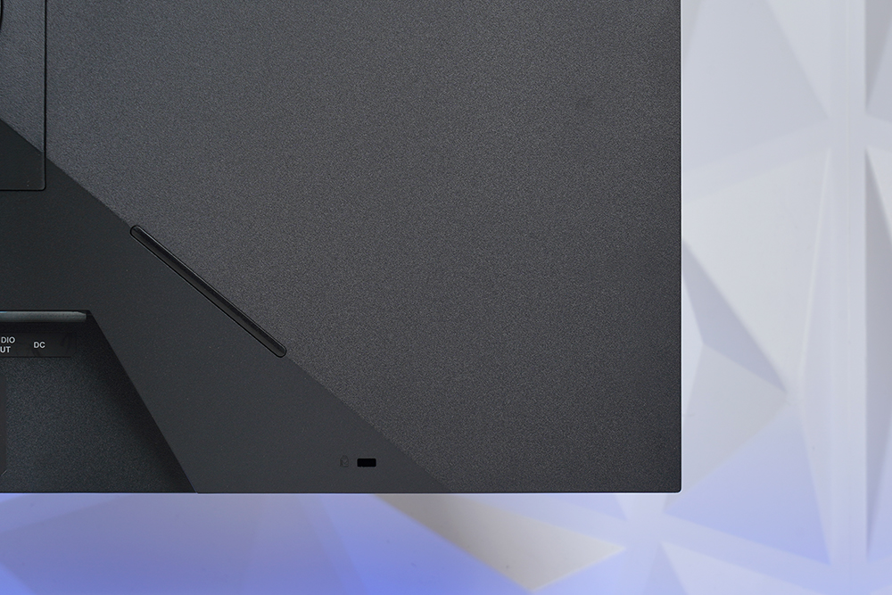 오른쪽 아래를 확인해 보면 켄싱턴 락 홈이 준비된 것을 확인할 수 있습니다. 주연테크 V27Q-M 모니터를 공개된 장소에 배치해서 사용해야 할 때 잠금장치를 연결하는 용도로 활용할 수 있습니다.