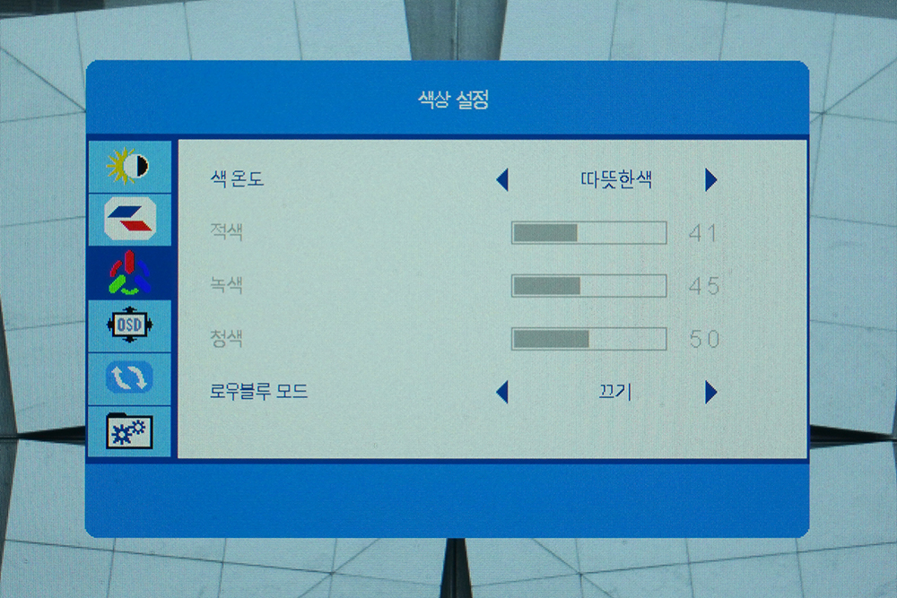 로우블루 모드의 경우에는 끄기와 강하게 그리고 보통과 약하게 설정할 수 있는데요. 파란색의 정도가 줄어들어서 눈의 피로도가 낮아집니다. 그렇지만 색상이 정확하게 표현되지는 않기 때문에 디자이너는 사용하지 않는 것이 좋을 것 같습니다.