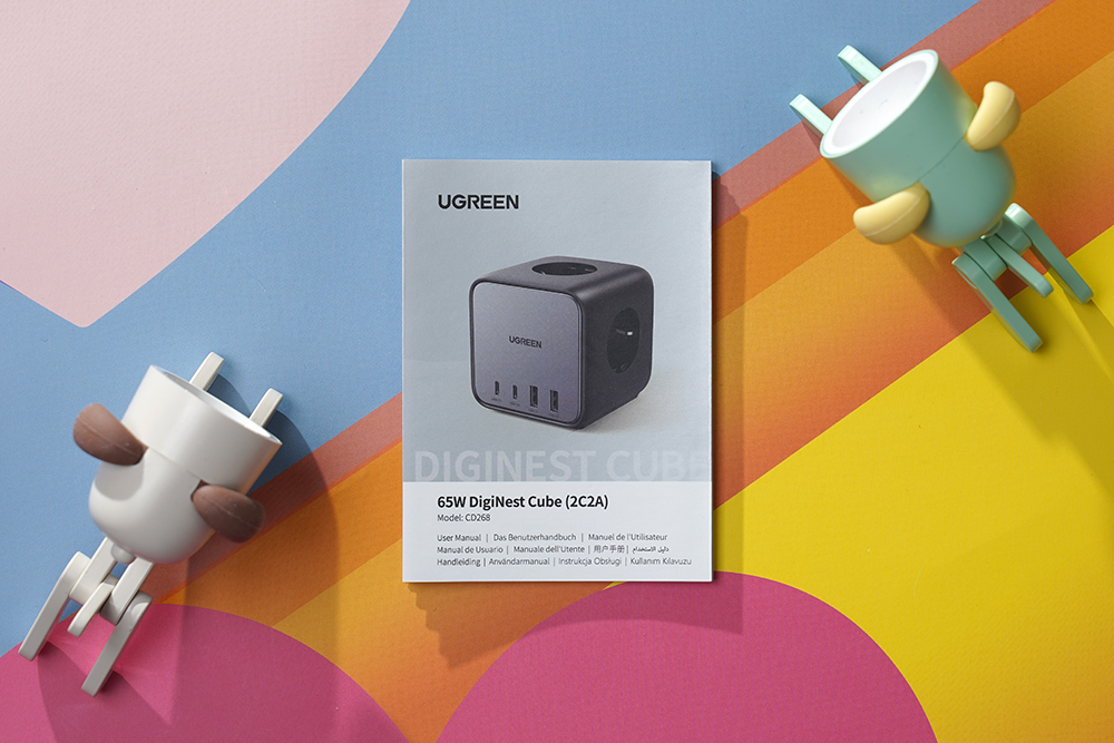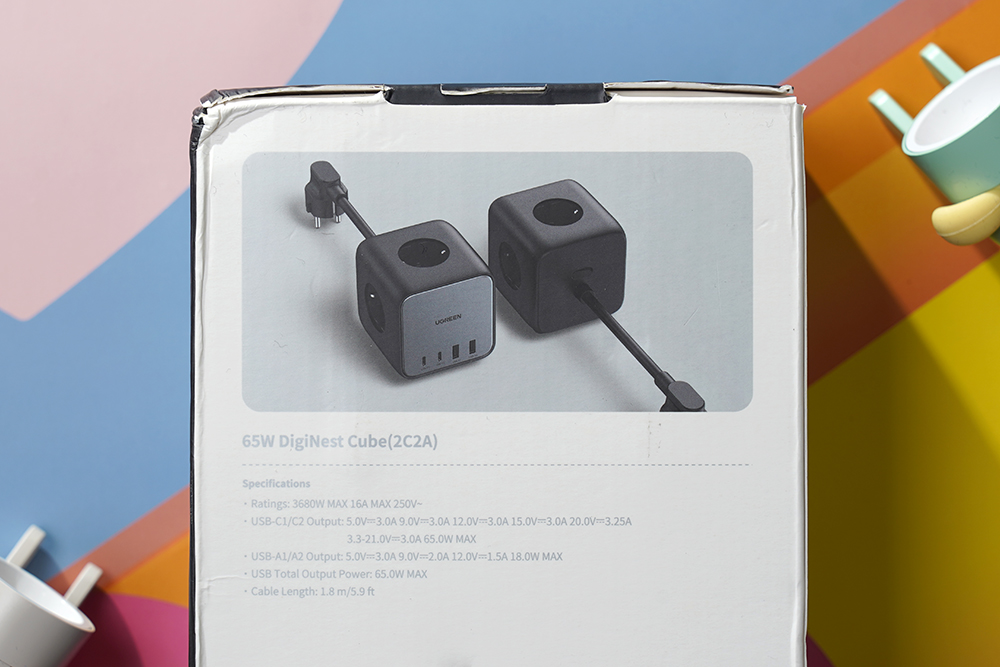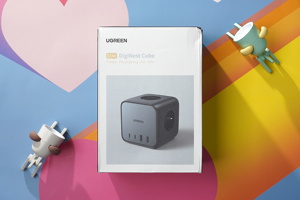 유그린 GaN 65W 멀티탭 + 멀티충전기의 박스를 살펴보면 전면에는 65W 출력을 제공하는 DigiNest Cube라는 문구와 함께 본체의 모습이 인쇄되어 있습니다. 패키지 전체의 크기는 크게 부담이 되는 편은 아니었습니다.